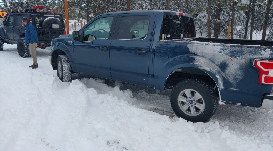 Albert, CO this morning. This truck doesn’t look like it’s stuck, but the nearly bald tires couldn’t get any traction and had turned everything under them into ice. Please, make sure to check your tread before the weather gets bad.