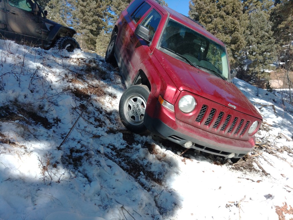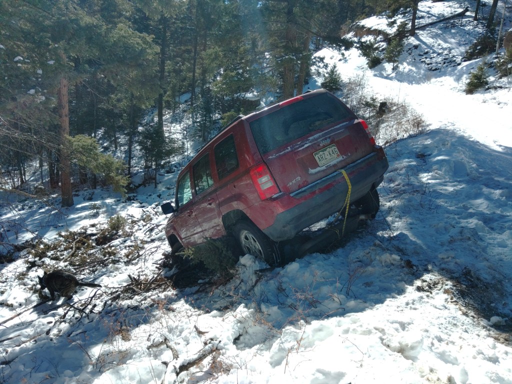 On my way down I came across a Jeep Patriot off the side of the road, sitting at a 45 deg angle. No one was around, so I took a few pics and left my info in case the owner came back.