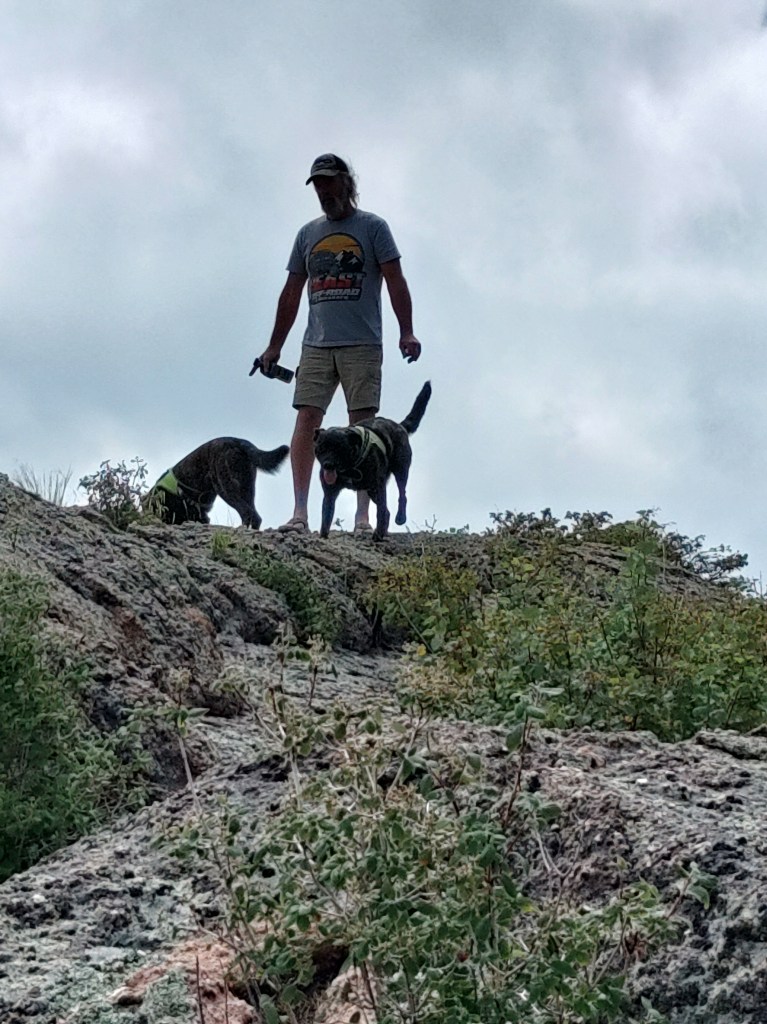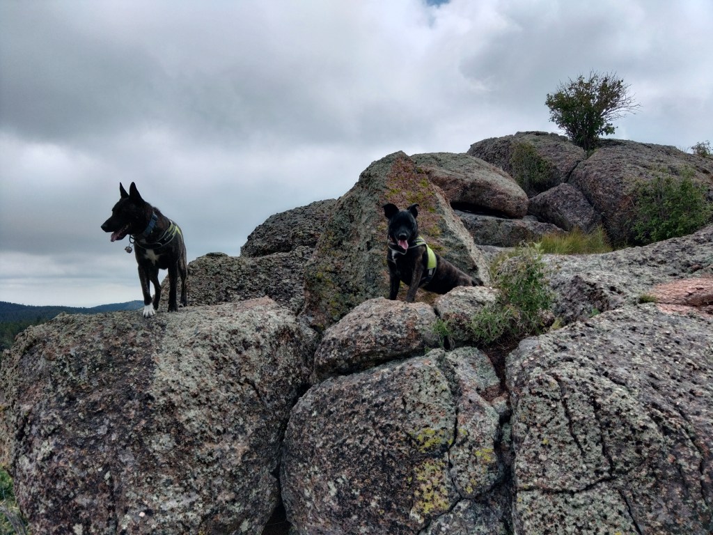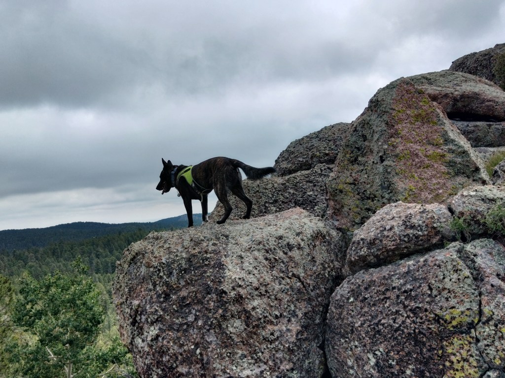 Scattered throughout the woods there were large rock outcroppings perfect for climbing. As I slowly picked my way over the boulders, testing my footing and precarious balance, Jeff and the dogs were already at the top. Swift and nimble, unafraid of the possibility of failing, they were rewarded with a spectacular view of the mountains and valley.