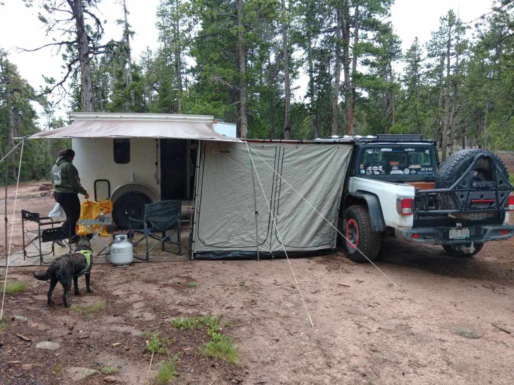 We have a cargo trailer conversion that has been modified to make off-road camping a breeze. We have used this camper in all weather, snow, rain, and heat; and have learned a lot on that journey. For this weekend’s getaway, we were faced with scattered rain and beautiful sunshine. With our camp set up, we were able to start a fire, kick back, and watch our dogs play as civilization slowly melted away.
