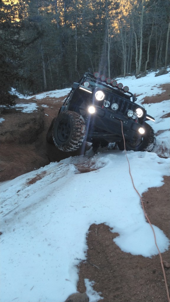 As I was coming back from a job in a nearby town I decided to take a short cut over the mountain. Let the dogs run and enjoy the fresh snow at 9000 feet. On my way down I came across a Jeep Patriot off the side of the road, sitting at a 45 deg … Continue reading Mt Herman Jeep recovery - A few more from yesterday.